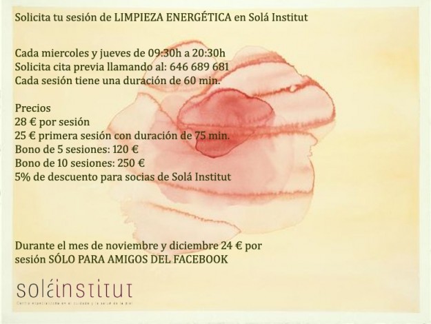 Solá Institut incorpora sesiones de Reiki como servicio para sus clientes. Cada miércoles y jueves de 09:30h a 20:30h en Solá Institut. Solicita cita previa llamando al: 646689681 Cada sesión tiene una duración de 45 minutos Precios: 25€ por sesión 20€ por primera sesión con duración de una hora Bono de 5 sesiones 105€…